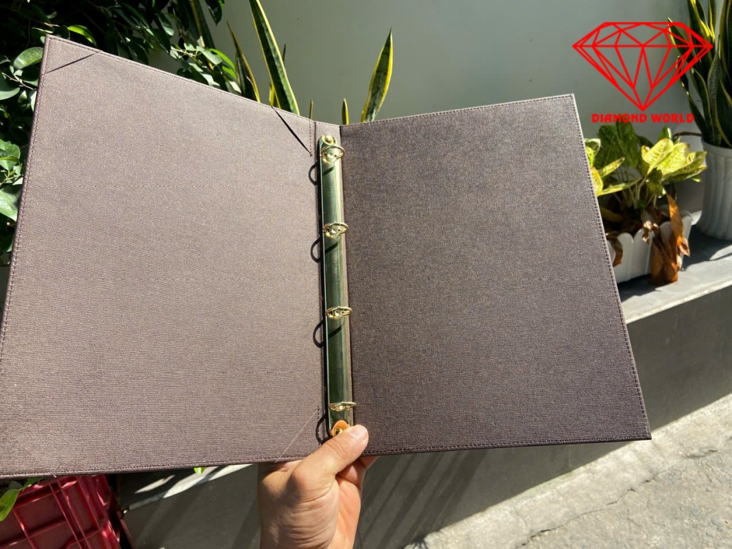 - **Chất liệu cao cấp**: Được sản xuất từ da PU chất lượng cao kết hợp với logo được khắc bằng inox sáng bóng, **Menu gáy còng DW001 không những nhìn : "ĐẲNG CẤP và SANG TRỌNG" mà nó còn đảm bảo độ bền lâu dài, giúp bạn yên tâm sử dụng trong thời gian dài mà không lo bị hư hỏng.